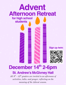 CYO (8th – 12th grades) – Sunday, December 14th, 2:00-6:00PM – McGivney Hall – Advent Afternoon Retreat – Register here: