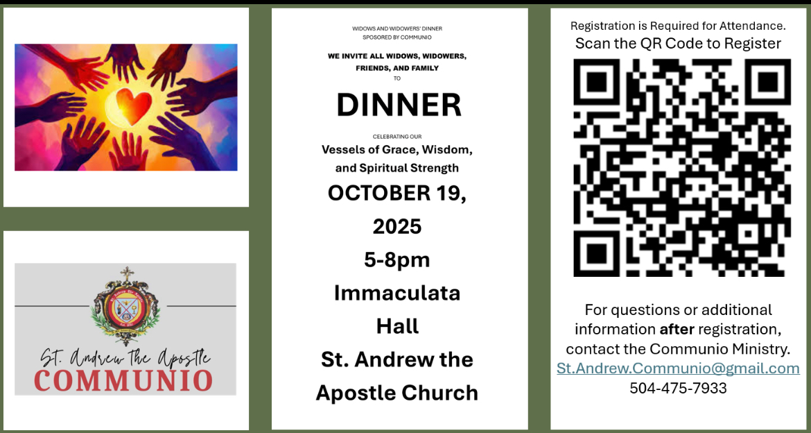 Communio will have a Widows, Widowers, Friends, and Family Dinner – Sunday, October 19th, from 5:00PM-8:00PM, in Immaculata Hall. Registration is required for attendance. Scan the QR code to register in the information flyer below. For questions or additional information after registration, contact the Communio Ministry at St.Andrew.Communio@gmail.com.