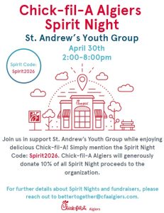 SANYO & Jr. CYO – Thursday, April 30th, 2:00-8:00pm – Chick-Fil-A Spirit Night Fundraiser – Algiers Chick-Fil-A